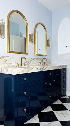 High-gloss navy lacquer cabinetry paired with Calacatta marble, unlacquered brass hardware, arched gilt mirrors, and classic black-and-white checkered stone flooring.