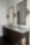 Deep charcoal cabinetry with honed black soapstone countertops and high backsplash, illuminated by linear brass sconces and arched antique mirrors.