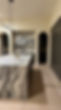 Custom fluted wood vanity nestled within a sweeping arched alcove, accented by warm ambient sconces, dual arched mirrors, and serene limestone hues.